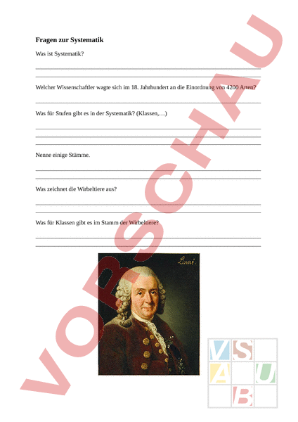 Fragen zur Systematik Was ist Systematik? Welcher Wissenschaftler wagte sich im 18. Jahrhundert an die Einordnung von 4200 Arten? Was für Stufen gibt es in der Systematik? (Klassen,) Nenne einige Stämme. Was zeichnet die Wirbeltiere aus? Was für Klassen gibt es im Stamm der Wirbeltiere?