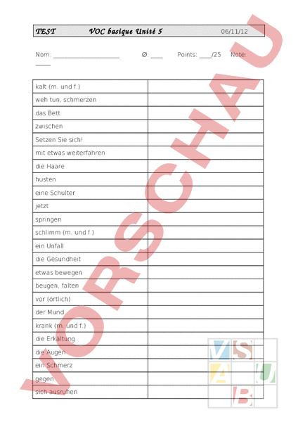 TEST VOC basique Unit é 5 Nom: kalt (m. und f.) weh tun, schmerzen das Bett zwischen Setzen Sie sich! mit etwas weiterfahren die Haare husten eine Schulter jetzt springen schlimm (m. und f.) ein Unfall die Gesundheit etwas bewegen beugen, falten vor (örtlich) der Mund krank (m. und f.) die Erkältung die Augen ein Schmerz gegen sich ausruhen : 06/11/12 Points: /25 Note: links