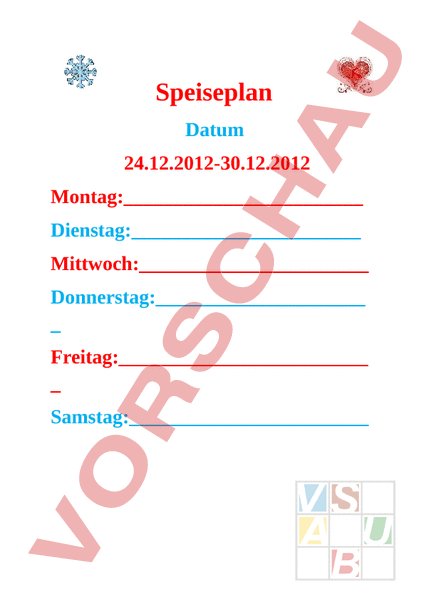 Speiseplan Datum 24.12.2012-30.12.2012 Montag: Dienstag:_ Mittwoch:_ Donnerstag:_ Freitag:_ Samstag: Sonntag: