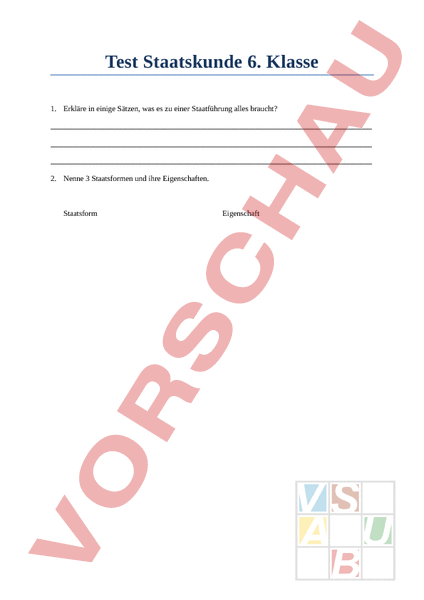 Test Staatskunde 6. Klasse 1. Erkläre in einige Sätzen, was es zu einer Staatführung alles braucht? 2. Nenne 3 Staatsformen und ihre Eigenschaften. Staatsform Eigenschaft 3. In welcher würdest du am liebsten leben? Warum? 4. Staatsgewalten: Ergänze folgende Tabelle: Staatsgewalt Legislative Beschreibung Erarbeitet neue Gesetze, führt Bauvorhaben aus, führt die Finanzen Ist in Murten Das Bezirksgericht Ist im Kt. FR Ist im Bund 5. Nenne die Namen der 7 Bundesräte und deren Parteizugehörigkeit. Ordne ihnen die nachfolgenden Departemente zu und umkreise die aktuelle Präsidentin des Bundesrates: EDA Eidgenössisches Departement des Äusseren EDI Eidgenössisches Departement des Innern EVD Eidgenössisches Volkswirtschaftsdepartement UVEK Umwelt, Verkehr und Kommunikation EJPD Eidgenössisches Justiz- und Polizeidepartement EFD Eid. Finanzdepartement VBS Verteidigung, Bevölkerungsschutz und Sport Name Partei Departement (Abkürzung) 6. Nenne ein Mitglied der Murtner Exekutive: 7. Und noch Thomas Spezial: Welche Partei hat im Generalrat Murten am meisten Sitze?
