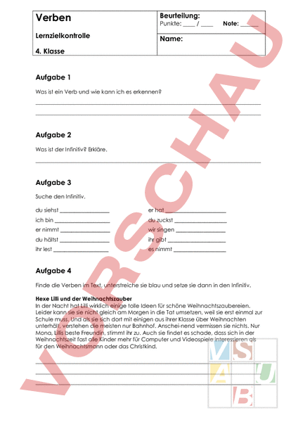 Verben Beurteilung: Lernzielkontrolle Name: Punkte: Note: 4. Klasse Aufgabe 1 Was ist ein Verb und wie kann ich es erkennen? Aufgabe 2 Was ist der Infinitiv? Erkläre. Aufgabe 3 Suche den Infinitiv. du siehst er hat ich bin du zuckst er nimmt wir singen du hältst ihr gibt ihr lest es nimmt Aufgabe 4 Finde die Verben im Text, unterstreiche sie blau und setze sie dann in den Infinitiv. Hexe Lilli und der Weihnachtszauber In der Nacht hat Lilli wirklich einige tolle Ideen für schöne Weihnachtszaubereien. Leider kann sie sie nicht gleich am Morgen in die Tat umsetzen, weil sie erst einmal zur Schule muss. Und als sie sich dort mit einigen aus ihrer Klasse über Weihnachten unterhält, verstehen die meisten nur Bahnhof. Anschei-nend vermissen sie nichts. Nur Mona, Lillis beste Freundin, stimmt ihr zu. Auch sie findet es schade, dass sich in der Weihnachtszeit fast alle Kinder mehr für Computer und Videospiele interessieren als für den Weihnachtsmann oder das Christkind. Aufgabe 5 Kreuze die richtige Person an und suche den Infinitiv. 1.P. 2.P. 3.P. 1.P. 2.P. 3.P. Sing. Sing. Sing. Plural Plural Plural Infinitiv du liegst er sitzt ihr fliegt sie spielt es plappert ihr kippt Aufgabe 6 Schreibe die Verben in der gewünschten Person. 2. P. Singular wickeln 2. P. Plural kommen 1. P. Plural fliegen 3. P. Plural sehen 2. P. Singular geben 3. P. Plural klettern 1. P. Singular sticken Aufgabe 7 Fülle die Tabelle aus. Infinitiv Personalformen lassen ihr du wir nehmen er wir du lesen er wir ich mögen ich er wir graben ich du ihr laden ich er wir stossen er du ihr lesen er wir ich Aufgabe 7 Nicht ganz einfach Verben. schwatzen du kreuzen du spitzen du putzen du würzen du stützen du holzen du Aufgabe 8 Suche zu den Verben je vier Vorsilben (ver-, unter-, be-, los-, auf-, usw.) stellen lassen fragen sehen Aufgabe 9 Schreibe ganze Sätze auf. die Hosen anziehen (du) ein neues Lied vorsingen (die Klasse) den Dieb ausfragen (die Polizei) die Frage nicht verstehen (ihr)