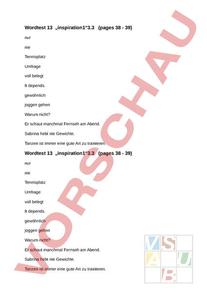 Wordtest 13 „inspiration13.3 (pages 38 39) nur nie Tennisplatz Umfrage voll belegt It depends. gewöhnlich joggen gehen Warum nicht? Er schaut manchmal Fernseh am Abend. Sabrina hebt nie Gewichte. Tanzen ist immer eine gute Art zu trainieren. Wordtest 13 „inspiration13.3 (pages 38 39) nur nie Tennisplatz Umfrage voll belegt It depends. gewöhnlich joggen gehen Warum nicht? Er schaut manchmal Fernseh am Abend. Sabrina hebt nie Gewichte. Tanzen ist immer eine gute Art zu trainieren.