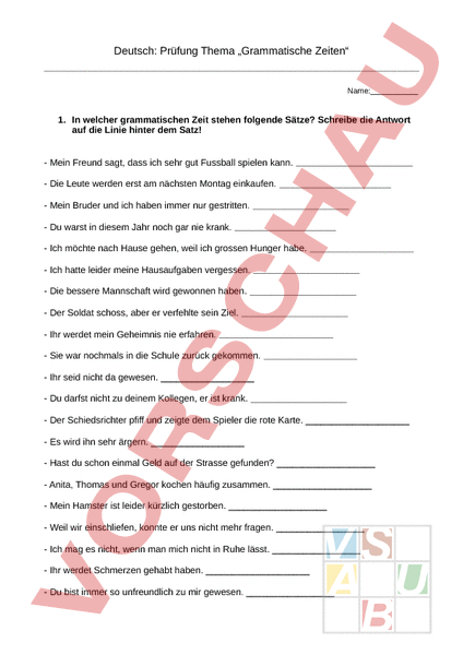 Deutsch: Prüfung Thema „Grammatische Zeiten Name:_ 1. In welcher grammatischen Zeit stehen folgende Sätze? Schreibe die Antwort auf die Linie hinter dem Satz! Mein Freund sagt, dass ich sehr gut Fussball spielen kann. Die Leute werden erst am nächsten Montag einkaufen. Mein Bruder und ich haben immer nur gestritten. Du warst in diesem Jahr noch gar nie krank. Ich möchte nach Hause gehen, weil ich grossen Hunger habe. Ich hatte leider meine Hausaufgaben vergessen. Die bessere Mannschaft wird gewonnen haben. Der Soldat schoss, aber er verfehlte sein Ziel. Ihr werdet mein Geheimnis nie erfahren. Sie war nochmals in die Schule zurück gekommen. Ihr seid nicht da gewesen. Du darfst nicht zu deinem Kollegen, er ist krank. Der Schiedsrichter pfiff und zeigte dem Spieler die rote Karte. Es wird ihn sehr ärgern. Hast du schon einmal Geld auf der Strasse gefunden? Anita, Thomas und Gregor kochen häufig zusammen. Mein Hamster ist leider kürzlich gestorben. Weil wir einschliefen, konnte er uns nicht mehr fragen. Ich mag es nicht, wenn man mich nicht in Ruhe lässt. Ihr werdet Schmerzen gehabt haben. Du bist immer so unfreundlich zu mir gewesen. 2. Verwandle diese Sätze in die angegebene Zeit in der Klammer! Jan schneidet mit dem Messer ein Stück Brot ab. (Präteritum) Viele Menschen kommen zum Zirkus. (Plusquamperfekt) Ich hatte noch nie Glück im Spiel. (Präsens) Wir schlossen die Tür ab. (Futur 1) Man hörte plötzlich nichts mehr von diesem seltsamen Mann. (Perfekt) Ihr seid immer nett zu uns gewesen. (Präteritum) Lionel Messi denkt gerne an sein erstes Spiel zurück. (Präteritum) Ich roch nichts, weil ich erkältet war. (Präsens) Sie gehen mit grossen Schritten der Strasse entlang. (Plusquamperfekt) Du wirst mich nie vergessen. (Perfekt) 3. Fülle die leeren Felder der Tabelle aus! Grundform (Infinitiv) Präteritum finden Ich fand ziehen gehen Ich war halten Ich stand streiten sitzen Ich log denken Ich tat erschrecken wissen Ich liess schlagen Ich brachte fallen fahren Ich roch fliegen steuern nehmen Punkte: von Note: