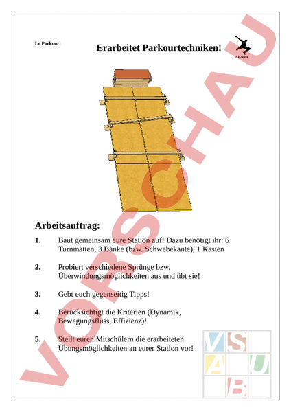 Le Parkour: Erarbeitet Parkourtechniken! Arbeitsauftrag: 1. Baut gemeinsam eure Station auf! Dazu benötigt ihr: 6 Turnmatten, 3 Bänke (bzw. Schwebekante), 1 Kasten 2. Probiert verschiedene Sprünge bzw. Überwindungsmöglichkeiten aus und übt sie! 3. Gebt euch gegenseitig Tipps! 4. Berücksichtigt die Kriterien (Dynamik, Bewegungsfluss, Effizienz)! 5. Stellt euren Mitschülern die erarbeiteten Übungsmöglichkeiten an eurer Station vor! Bearbeitungszeit: 12 Minuten!!!