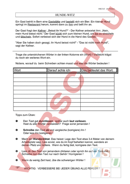 DIKTAT (84 Wörter) HUNDE-WITZ Ein Gast betritt in Bern eine Gaststätte und bestellt sich ein Bier. Ein kleiner Hund springt im Restaurant herum, kommt dann zu ihm und bellt ihn an. Der Gast fragt den Kellner: „Beisst ihr Hund? Der Kellner antwortet ihm: „Nein, mein Hund beisst nicht. Der Gast bückt sich zum kleinen Hund, um ihn zu streicheln und tätscheln. Sofort verbeisst sich der Hund in die Hand des Gastes. Aber Sie haben doch gesagt, ihr Hund beisst nicht! Das ist nicht mein Hund, sagt der Kellner. Trage die unterstrichenen Wörter in der linken Kolonne ein (Wort) Vielleicht trägst du noch ein weiteres Wort ein. Notiere, worauf du beim Schreiben achten musst und was die Wörter bedeuten Wort Darauf achte ich: Das bedeutet das Wort: Tipps zum Üben: Den Text gut durchlesen, später auch laut vorlesen. Hast du alle Wörter verstanden? Frage sonst jemanden Schreibe den Text ab und vergleiche (korrigiere) ihn Oder lass ihn korrigieren Mach ein Wanderdiktat. Das heisst: Lege den Text etwa 3-4 Meter von deinem Arbeitsplatz weg. Lies soviel, wie du im Kopf behalten kannst, wandere an deinen Platz und notiere. Wenn du fertig bist, korrigiere den Text. Lass dir den Text von jemandem diktieren oder sprich ihn auf ein Tonband Schreibe nun den Text nur nach Gehör Korrigieren Wenn du wenig Zeit hast, übe die schwierigen Wörter WICHTIG: VERBESSERE BEI JEDER ÜBUNG ALLE FEHLER