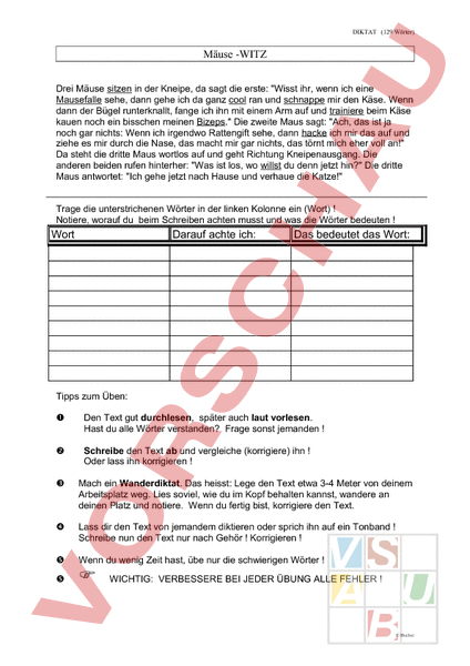 DIKTAT (129 Wörter) Mäuse -WITZ Drei Mäuse sitzen in der Kneipe, da sagt die erste: Wisst ihr, wenn ich eine Mausefalle sehe, dann gehe ich da ganz cool ran und schnappe mir den Käse. Wenn dann der Bügel runterknallt, fange ich ihn mit einem Arm auf und trainiere beim Käse kauen noch ein bisschen meinen Bizeps. Die zweite Maus sagt: Ach, das ist ja noch gar nichts: Wenn ich irgendwo Rattengift sehe, dann hacke ich mir das auf und ziehe es mir durch die Nase, das macht mir gar nichts, das törnt mich eher voll an! Da steht die dritte Maus wortlos auf und geht Richtung Kneipenausgang. Die anderen beiden rufen hinterher: Was ist los, wo willst du denn jetzt hin? Die dritte Maus antwortet: Ich gehe jetzt nach Hause und verhaue die Katze! Trage die unterstrichenen Wörter in der linken Kolonne ein (Wort) Notiere, worauf du beim Schreiben achten musst und was die Wörter bedeuten Wort Darauf achte ich: Das bedeutet das Wort: Tipps zum Üben: Den Text gut durchlesen, später auch laut vorlesen. Hast du alle Wörter verstanden? Frage sonst jemanden Schreibe den Text ab und vergleiche (korrigiere) ihn Oder lass ihn korrigieren Mach ein Wanderdiktat. Das heisst: Lege den Text etwa 3-4 Meter von deinem Arbeitsplatz weg. Lies soviel, wie du im Kopf behalten kannst, wandere an deinen Platz und notiere. Wenn du fertig bist, korrigiere den Text. Lass dir den Text von jemandem diktieren oder sprich ihn auf ein Tonband Schreibe nun den Text nur nach Gehör Korrigieren Wenn du wenig Zeit hast, übe nur die schwierigen Wörter WICHTIG: VERBESSERE BEI JEDER ÜBUNG ALLE FEHLER Bucher