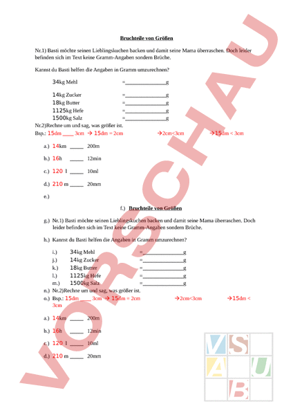 Bruchteile von Größen Nr.1) Basti möchte seinen Lieblingskuchen backen und damit seine Mama überraschen. Doch leider befinden sich im Text keine Gramm-Angaben sondern Brüche. Kannst du Basti helfen die Angaben in Gramm umzurechnen? 34kg Mehlg 14kg Zuckerg 18kg Butterg 1125kg Hefeg 1500kg Salzg Nr.2)Rechne um und sag, was größer ist. Bsp.: 15dm 3cm 15dm 2cm 2cm
