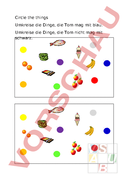 Hörübung. LP bildet Sätze wie z.B.:Tom likes oranges. SuS müssen die Orangen dann mit einer bestimmten Farbe umkreisen. Bei Dingen, die Tom nicht mag verwenden SuS eine andere Farbe um den Gegenstand zu umkreisen.
