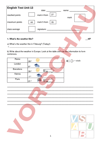 English Test Unit 13 date: reached points name: 27 mark 4 from mark maximum points 44 class average mark 5 from 35 signature: 1. Whats the weather like? /6P a) Whats the weather like in Fribourg? (Today!) b) Write about the weather in Europe. Look at the table and use the information to form sentences. Rome winds 28 London 8 Barcelona 39 Vienna 1 Paris 21 1 2. What is he doing right now?/4 He He He He 3. Find the questions to these answers. /6 a) Yes, am watching film. b)_ No, we arent riding horse. c) No, she is not singing at the moment. d) Yes, they are cooking meal right now. e) No, it isnt snowing this evening. f) Yes, he is working very hard. 2 5.) lot of/ much many complete the sentences!/5 a) There are people in the train to Bern, but not in the train to Geneva. b) Dont make so noise! c) We cant see cats in the street, but dogs in the forest. d) She has books. e) How milk do you want in your tea? f) We dont have time. g) John hasnt money. h) Do you know discos in Fribourg? 6. (a) little (a) few: fill in the gaps!/2 a) There are sandwiches left. b) There is milk in the bottle. c) There is butter left. d) restaurants open at 6 p.m. 7. Look at this picture of the museum. What are these people doing where? /10 Write 10 sentences! 3 Find the sentence! sun isnt the shining anymore. riding he is bike over his the obstacle. are race /still they running the 80 m. smoke it is behind not allowed to the toilet. did any you during problems have the fete? 2. Verb training Put he verbs into the correct tense! Infinitive Past tense Present progressive sing we sang we are singing run she she sell he he smoke it it 4 do we we meet you you know sleep they they take it It make she she give he he 3. Much or many? How water is in this pool? Are there finalists in the race? How pupils are in your class? There isnt tea left. Dont make so noise! 4. Much, little, little, few, many, few With help you can do it. He hasnt got mistakes in the test. How butter do you want? We only have dollars left. How sisters have you got? 5. Write the sentence using the present progressive (-ing-form) She is . on chair. Laura is . ready for the race. (get) Kate is . over the wall. (climb) Tina is . her name on the poster Tim is . three biscuits. Task E1 – Listening [7 points] 5 right wrong Theres queue in front of the coffee shop. right wrong Tony is cutting new cake. right wrong There isnt much bread left. right wrong Tony and Christina have got lot to do. right wrong They have still got lot of fruit and chocolate cake. right wrong Theyre serving coffee, tea and fruit juices. right wrong There are only two bottles of milk left. Exercise 1: Listen to the text. Colour the right sentences in green and the wrong ones in blue! 1. It will be nice weather 2. People like the music that band is playing. 3. The band is playing Rock nroll music. 4. Many people are waiting at the coffee shop. 5. People are getting angry because there arent any hamburgers and hot dogs left. 6. Its boring on the sports field. 7. One of the finalists had an accident. 8. The obstacle course was too easy. 9. The director is taking pictures of the runners of the 80 meter race. 6