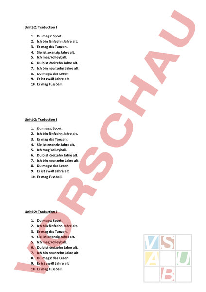 Unité 2: Traduction I 1. 2. 3. 4. 5. 6. 7. 8. 9. 10. Du magst Sport. Ich bin fünfzehn Jahre alt. Er mag das Tanzen. Sie ist zwanzig Jahre alt. Ich mag Volleyball. Du bist dreizehn Jahre alt. Ich bin neunzehn Jahre alt. Du magst das Lesen. Er ist zwölf Jahre alt. Er mag Fussball. Unité 2: Traduction I 1. 2. 3. 4. 5. 6. 7. 8. 9. 10. Du magst Sport. Ich bin fünfzehn Jahre alt. Er mag das Tanzen. Sie ist zwanzig Jahre alt. Ich mag Volleyball. Du bist dreizehn Jahre alt. Ich bin neunzehn Jahre alt. Du magst das Lesen. Er ist zwölf Jahre alt. Er mag Fussball. Unité 2: Traduction I 1. 2. 3. 4. 5. 6. 7. 8. 9. 10. Du magst Sport. Ich bin fünfzehn Jahre alt. Er mag das Tanzen. Sie ist zwanzig Jahre alt. Ich mag Volleyball. Du bist dreizehn Jahre alt. Ich bin neunzehn Jahre alt. Du magst das Lesen. Er ist zwölf Jahre alt. Er mag Fussball.