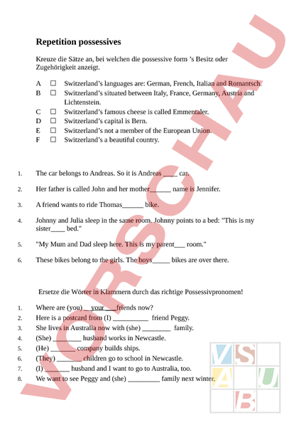 Repetition possessives Kreuze die Sätze an, bei welchen die possessive form Besitz oder Zugehörigkeit anzeigt. B D F Switzerlands languages are: German, French, Italian and Romantsch. Switzerlands situated between Italy, France, Germany, Austria and Lichtenstein. Switzerlands famous cheese is called Emmentaler. Switzerlands capital is Bern. Switzerlands not member of the European Union. Switzerlands beautiful country. 1. The car belongs to Andreas. So it is Andreas car. 2. Her father is called John and her mother name is Jennifer. 3. friend wants to ride Thomas bike. 4. Johnny and Julia sleep in the same room. Johnny points to bed: This is my sister bed. 5. My Mum and Dad sleep here. This is my parent_ room. 6. These bikes belong to the girls. The boys_ bikes are over there. Ersetze die Wörter in Klammern durch das richtige Possessivpronomen! 1. 2. 3. 4. 5. 6. 7. 8. Where are (you) yourfriends now? Here is postcard from (I) friend Peggy. She lives in Australia now with (she) family. (She) husband works in Newcastle. (He) company builds ships. (They) children go to school in Newcastle. (I) husband and want to go to Australia, too. We want to see Peggy and (she) family next winter.