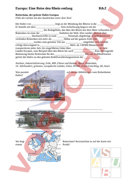 Europa: Eine Reise den Rhein entlang R&Z Rotterdam, der grösste Hafen Europas Fülle die Lücken mit den Ausdrücken unter dem Text! Der Hafen von liegt an der Mündung des Rheins in die . Er besteht seit dem . Sein Aufschwung begann mit der des Ruhrgebiets, das über den Rhein mit dem Meer verbunden ist. Rotterdam ist einer der Seehäfen der Welt. Hier werden jährlich über Hochseeschiffe in rund Terminals abgefertigt. Schifffahrtslinien verbinden Rotterdam mit mehr alsHäfen auf der ganzen Erde. Die werden zum grössten Teil aus eingeführt. Die Ausfuhr erfolgt überwiegend in . Mehr als 130 00 Binnenschiffe transportieren jedes Jahr die eingeführten Güter über in viele Länder Europas, zum Beispiel über den Rhein bis nach. Eine überragende Bedeutung besitzt Rotterdam für den . Mit vier Erdölraffinerien gehört der Hafen zu den grössten Rohölverarbeitungszentren der. Nordsee, Industrialisierung, Erde, 800, Flüsse und Kanäle, Basel, Rotterdam, 14. Jahrhundert, grössten, europäische Länder, Güter, 30 00, Erdöl-Umschlag, 60, Asien Was passiert Hafen? auf diesen Abbildungen vom Rotterdamer Wo liegt einem Rotterdam? Kennzeichne es auf der Karte mit Punkt! Lösung Fülle die Lücken mit den Wörtern unter dem Text! Der Hafen von Rotterdam liegt an der Mündung des Rheins in die Nordsee. Er besteht seit dem 14. Jahrhundert. Sein Aufschwung begann mit der Industrialisierung des Ruhrgebiets, das über den Rhein mit dem Meer verbunden ist. Rotterdam ist einer der grössten Seehäfen der Welt. Hier werden jährlich über 30 00 Hochseeschiffe in rund 60 Terminals abgefertigt. Schifffahrtslinien verbinden Rotterdam mit mehr als 800 Häfen auf der ganzen Erde. Die Güter werden zum grössten Teil aus Asien eingeführt. Die Ausfuhr erfolgt überwiegend in europäische Länder. Mehr als 130 00 Binnenschiffe transportieren jedes Jahr die eingeführten Güter über Flüsse und Kanäle in viele Länder Europas, zum Beispiel über den Rhein bis nach Basel. Eine überragende Bedeutung besitzt Rotterdam für den ErdölUmschlag. Mit vier Erdölraffinerien gehört der Hafen zu den grössten Rohölverarbeitungszentren der Erde. 1. Bild: ein Containerschiff wird beladen 2. Bild: ein Containerschiff verlässt den Hafen in Richtung Meer