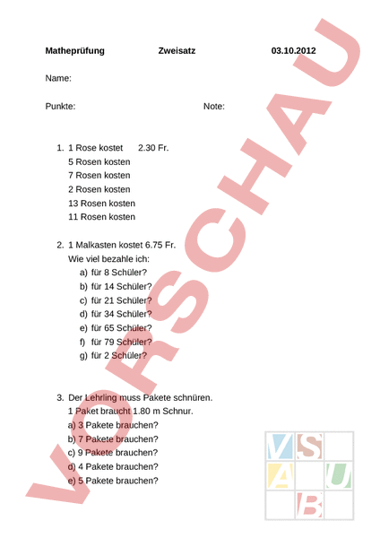 Matheprüfung Zweisatz 03.10.2012 Name: Punkte: Note: 1. 1 Rose kostet 2.30 Fr. 5 Rosen kosten 7 Rosen kosten 2 Rosen kosten 13 Rosen kosten 11 Rosen kosten 2. 1 Malkasten kostet 6.75 Fr. Wie viel bezahle ich: a) für 8 Schüler? b) für 14 Schüler? c) für 21 Schüler? d) für 34 Schüler? e) für 65 Schüler? f) für 79 Schüler? g) für 2 Schüler? 3. Der Lehrling muss Pakete schnüren. 1 Paket braucht 1.80 Schnur. a) 3 Pakete brauchen? b) 7 Pakete brauchen? c) 9 Pakete brauchen? d) 4 Pakete brauchen? e) 5 Pakete brauchen? f) 11 Pakete brauchen? 4. 7 Gläser fassen 2l 1 dl Wasser. Wie viel hat in 1 Glas Platz? 5. 4 Heftpakete wiegen 6 kg. Wie schwer ist 1 Pakete
