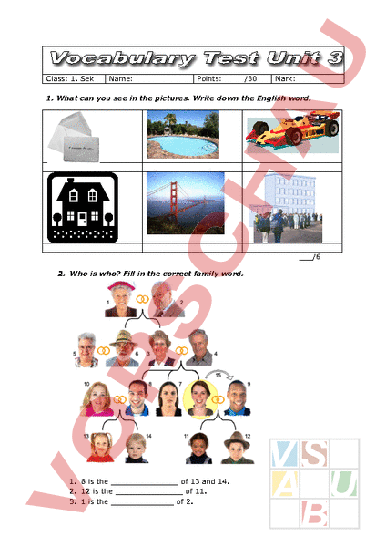 Class: 1. Sek Name: Points: /30 Mark: 1. What can you see in the pictures. Write down the English word./6 2. Who is who? Fill in the correct family word. 1. 8 is the of 13 and 14. 2. 12 is the of 11. 3. 1 is the of 2. 4. 5. 6. 7. 8. 13 is the of 10 and 8. 3 is the of 11 and 12. 11 is the of 12. 9 is the of 7. 14 is the of 10 and 8./8 3. Translate into German. 1. How many? 2. over there 3. earthquake 4. dear 5. Its nice to have you here. 6. at home 7. Im fine. 8. about /8 4. Translate into English. 1. gehen 2. Jahr 3. Wie geht es dir/Ihnen? 4. morgen 5. wirklich 6. lesen 7. vor (räumlich) 8. gefährlich /8