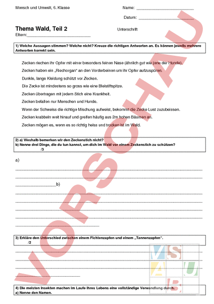 Eine Lernkontrolle zu den Themen Zecken, Unterschied Tannenzapfen/ Fichtenzapfen, Insekten (Metamorphose), Waldschädlinge, Ameisen, Kreislauf Sauerstoff/Kohlenstoffdioxid, Problematik Regenwaldrodung.