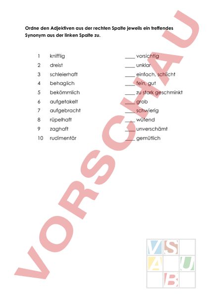 Ordne den Adjektiven aus der rechten Spalte jeweils ein treffendes Synonym aus der linken Spalte zu. 1 knifflig vorsichtig 2 dreist unklar 3 schleierhaft einfach, schlicht 4 behaglich fein, gut 5 bekömmlich zu stark geschminkt 6 aufgetakelt grob 7 aufgebracht schwierig 8 rüpelhaft wütend 9 zaghaft unverschämt 10 rudimentär gemütlich