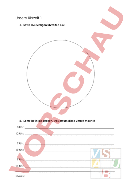 Unsere Uhrzeit 1 1. Setze die richtigen Uhrzeiten ein! 2. Schreibe in die Lücken, was du um diese Uhrzeit machst! 0 Uhr: 12 Uhr: 7 Uhr: 19 Uhr: 9 Uhr: 21 Uhr: Uhrzeiten