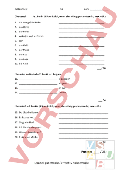 mots unité 7 5b nom: _ Übersetze! Je 1 Punkt (0.5 zusätzlich, wenn alles richtig geschrieben ist, max. 2P.) 1. die Wange/die Backe 2. das Hemd 3. der Koffer 4. weiss (m. und w. Form!) 5. sein 6. das Kleid 7. der Mund 8. der Hut 9. das Auge 10. die Nase Übersetze ins Deutsche! 1 Punkt pro Aufgabe / 10 11. le pantalon 12. les yeux 13. en cuir 14. Devine. / 4 Übersetze! Je 2 Punkte (0.5 zusätzlich, wenn alles richtig geschrieben ist, max. 1P.) 15. Du bist die Dame. 16. Es ist aus Holz. 17. Singt ein Lied. 18. Ich bin das Gespenst. 19. Woraus besteht es? 20. Es ist eine Maske. / 12 Punkte: / 26 Lernziel: gut erreicht / erreicht / nicht erreicht