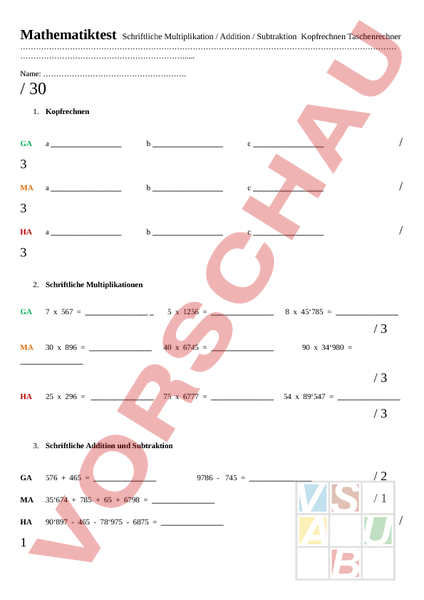 Mathematiktest Schriftliche Multiplikation Addition Subtraktion Kopfrechnen Taschenrechner . Name: . 30 1. Kopfrechnen GA 3 MA 3 HA 3 2. Schriftliche Multiplikationen GA 7 567 5 1256 8 45‘785 /3 MA 30 896 40 6745 90 34‘980 /3 HA 25 296 75 6777 54 89‘547 /3 3. Schriftliche Addition und Subtraktion GA 576 465 MA 35‘674 785 65 6798 HA 90‘897 465 78‘975 6875 1 9786 745 /2 /1 4. Taschenrechner Separates Aufgabenblatt! Mathematiktest Teil 2 Taschenrechneraufgaben Name: GA 867 456 98‘880 40 MA Dreiundfünfzigtausend siebenhundertachtzehn sechshundertfünfundsechzig /2 Eine Million vierhundertzweitausend und neunzehn dreiundneunzigtausend und drei /2 HA 67‘777 675‘765 21‘480 895 78 201‘474 /4 98‘897 574‘674 Mathematiktest Teil 2 Taschenrechneraufgaben Name: GA 867 456 98‘880 40 MA Dreiundfünfzigtausend siebenhundertachtzehn sechshundertfünfundsechzig /2 Eine Million vierhundertzweitausend und neunzehn dreiundneunzigtausend und drei /2 HA 67‘777 675‘765 21‘480 895 78 201‘474 98‘897 574‘674 /4