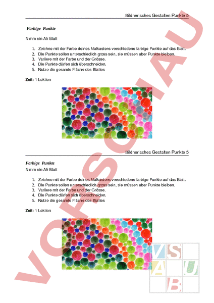 Bildnerisches Gestalten Punkte 5 Farbige Punkte Nimm ein A5 Blatt 1. 2. 3. 4. 5. Zeichne mit der Farbe deines Malkastens verschiedene farbige Punkte auf das Blatt. Die Punkte sollen unterschiedlich gross sein, sie müssen aber Punkte bleiben. Variiere mit der Farbe und der Grösse. Die Punkte dürfen sich überschneiden. Nutze die gesamte Fläche des Blattes Zeit: 1 Lektion Bildnerisches Gestalten Punkte 5 Farbige Punkte Nimm ein A5 Blatt 1. 2. 3. 4. 5. Zeichne mit der Farbe deines Malkastens verschiedene farbige Punkte auf das Blatt. Die Punkte sollen unterschiedlich gross sein, sie müssen aber Punkte bleiben. Variiere mit der Farbe und der Grösse. Die Punkte dürfen sich überschneiden. Nutze die gesamte Fläche des Blattes Zeit: 1 Lektion