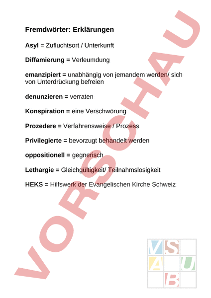 Fremdwörter: Erklärungen Asyl Zufluchtsort Unterkunft Diffamierung Verleumdung emanzipiert unabhängig von jemandem werden/ sich von Unterdrückung befreien denunzieren verraten Konspiration eine Verschwörung Prozedere Verfahrensweise Prozess Privilegierte bevorzugt behandelt werden oppositionell gegnerisch Lethargie Gleichgültigkeit/ Teilnahmslosigkeit HEKS Hilfswerk der Evangelischen Kirche Schweiz Kein Kuchen für Bahar Beantwortet zu zweit folgende Fragen: 1. Wovor hat Bahar Angst? • Angst gegen die Gesetze zu verstossen (Ampelsituation) • Angst vor der Ausweisung • Angst vor sozialer Erniedrigung 2. Wann flüchtete Bahar in die Schweiz? 1985 3. Weshalb musste sie aus der Türkei flüchten? Sie ging für die Rechte der Frau auf die Strasse (emanzipierte Frau) und hat Flugblätter (Selbstbestimmungsrecht) für Kurden geschrieben. Sie hatte Angst vor Verhaftung, Foltermethoden und Vergewaltigung durch Polizisten. Sie hatte auch grosse Angst, dass ihr Kind misshandelt würde. 4. Wo findest du im Text konkrete fremdenfeindliche Äusserungen? Schreibe sie heraus! „Sie sind Türkin? Aber Sie sehen doch intelligent aus. „Wissen Sie, Türken wollen das sonst nicht; das Geld reut sie. „Wissen Sie, wir haben unsere Erfahrungen mit Türken.