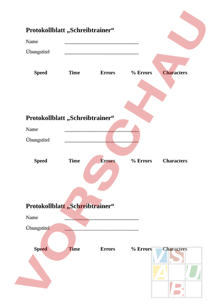 Protokollblatt „Schreibtrainer Name Übungstitel Speed Time Errors Errors Characters Protokollblatt „Schreibtrainer Name Übungstitel Speed Time Errors Errors Characters Protokollblatt „Schreibtrainer Name Übungstitel Speed Time Errors Errors Characters