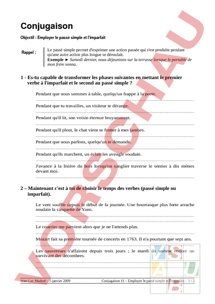 Conjugaison Objectif Employer le passé simple et limparfait Rappel Le passé simple permet dexprimer une action passée qui sest produite pendant quune autre action plus longue se déroulait. Exemple Samedi dernier, nous déjeunions sur la terrasse lorsque le portable de mon frère sonna. 1 Es-tu capable de transformer les phases suivantes en mettant le premier verbe à limparfait et le second au passé simple Pendant que nous sommes à table, quelquun frappe à la porte. . Pendant que tu travailles, un visiteur te dérange. . Pendant quil lit, son voisin éternue bruyamment. . Pendant quil pleut, le chat vient se frotter à mes jambes. . Pendant que nous parlons, quelquun te demande. . Pendant quils marchent, un éclair les aveugle soudain. . Javance à la lisière du bois lorsquun sanglier traverse le sentier à dix mètres devant moi. . 2 – Maintenant cest à toi de choisir le temps des verbes (passé simple ou imparfait). Le vent souffle depuis le début de la journée. Une bourrasque plus forte arrache soudain la casquette de Yann. . . Le courrier me parvient alors que je ne lattends plus. . Mozart fait sa première tournée de concerts en 1763. Il na pourtant que sept ans. . Les sauveteurs saffairent depuis trois jours le mardi ils sortent encore un survivant des décombres. . . Jean-Luc Madoré – 5 janvier 2009 Conjugaison 11 – Employer le passé simple et limparfait 1 2 Corrigé Maîtriser lemploi du passé simple 1 Es-tu capable de transformer les phases suivantes en mettant le premier verbe à limparfait et le second au passé simple Pendant que nous sommes à table, quelquun frappe à la porte. Pendant que nous étions à table, quelquun frappa à la porte. Pendant que tu travailles, un visiteur te dérange. Pendant que tu travaillais, un visiteur te dérangea. Pendant quil lit, son voisin éternue bruyamment. Pendant quil lisait, son voisin éternua bruyamment. Pendant quil pleut, le chat vient se frotter à mes jambes. Pendant quil pleuvait, le chat vint se frotter à mes jambes. Pendant que nous parlons, quelquun te demande. Pendant que nous parlions, quelquun te demanda. Pendant quils marchent, un éclair les aveugle soudain. Pendant quils marchaient, un éclair les aveugla soudain. Javance à la lisière du bois lorsquun sanglier traverse le sentier. Javançais à la lisière du bois lorsquun sanglier traversa le sentier. 2 – Maintenant cest à toi de choisir le temps des verbes (passé simple ou imparfait ?). Le vent souffle depuis le début de la journée. Une bourrasque plus forte arrache soudain la casquette de Yann. Le vent soufflait depuis le début de la journée. Une bourrasque plus forte arracha soudain la casquette de Yann. Le courrier me parvient alors que je ne lattends plus. Le courrier me parvint alors que je ne lattendais plus. Mozart fait sa première tournée de concerts en 1763. Il na pourtant que sept ans. Mozart fit sa première tournée de concerts en 1763. Il navait pourtant que sept ans. Les sauveteurs saffairent depuis trois jours le mardi ils sortent encore un survivant des décombres. Les sauveteurs saffairaient depuis trois jours le mardi ils sortirent encore un survivant des décombres. Jean-Luc Madoré – 5 janvier 2009 Conjugaison 11 – Employer le passé simple et limparfait 2 2
