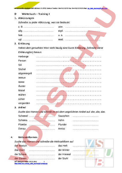 iM UP DATE LEARNING Rotfluhstr. 61 8702 Zollikon Telefon: 044 912 02 93 Fax: 044 912 02 92 E-Mail: D Wörterbuch – Training 1. Abkürzungen Schreibe zu jeder Abkürzung, was sie bedeutet. z. B. usw. . allg. eigtl. . fam. u. a. vgl. med. . . 2. Erklärung Neben dem gesuchten Wort steht häufig eine kurze Erklärung. Schreibe diese Erklärung(en) heraus. Herberge Person Stil Stichel abgemergelt immun Imme illuster Makel mähen schier verganden 3. Artikel Suche das Nomen und schreib es mit dem angeführten Artikel auf: der, die, das. Schemel Saxophon Schema Hohn Plombe Plunder Donau Anriss Mehrzahlformen 4. Suche das Nomen und schreibe die Mehrzahlform auf der Marsch das Heft das Garn der Winter die Schere der Himmel der Garten der Stuhl IM Intelligent Matter 19.12.2012 1