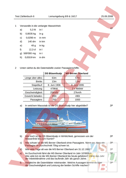 Test Zahlenbuch 6 1 2 Lernumgebung 8/9 16/17 25.09.2008 Verwandle in die verlangte Masseinheit: 4P a) 5,3 hl b) 0,0035 kg in c) 0,0290 in mm d) 140 dm in km e) 40 in kg f) 12,3 cl in g) 569 00 mg in h) in dm 0,0319 km in Unten siehst du die Datentabelle zweier Passagierschiffe: DS Blüemlisalp MS Berner Oberland Länge über alles: 63m 57m Breite: 13m 12m 8. Juni 1906 8. Juni 1995 Leistung: 478kW 2 490kW Geschwindigkeit: 25km/h 27km/h Gewicht beladen: 390t 490t Passagiere: 750 1000 Stapellauf: a) In welchem Massstab ist die DS Blüemlisalp hier abgebildet? 2P b) Wie hoch ist die DS Blüemlisalp in Wirklichkeit, gemessen von der Wasserlinie bis zum Kamin? 2P c) Wie schwer ist die MS Berner Oberland ohne Passagiere. Nimm an, dass ein Passagier im Durchschnitt 75kg schwer ist. 2P d) Wie viele Tage alt war die MS Berner Oberland am 31.12.1996? 2P e) Im Durchschnitt fährt die MS Berner Oberland im Jahr 10000km. Wie viele km ist die MS Berner Oberland bis heute gefahren? Zähle das Jahr der Inbetriebnahme und das laufende Jahr als ganze Jahre. 2P f) Vergleiche die Datenblätter miteinander. Welche Aussagen kannst du über die Geschwindigkeit und Leistung der beiden Schiffe machen? 2P 3 4 5 6 7 Setze (ist grösser als), (ist kleiner als) und (ist gleich wie) so ein, dass eine wahre Aussage entsteht: a) 8,576 b) 23,009 23,000989 c) 0,3303 0,3033 d) 23,099 23,09900 2P 8,567 Runde jeweils auf die gewünschte Genauigkeit: 3P a) 35,34083 auf Tausendstel d) 7,4545 auf Zehntel b) 379,499 auf Einer e) 99,8761 auf Tausender c) 5,89899 auf Zehntausendstel f) 149,99 auf Hunderter Berechne die fehlenden Werte in der Tabelle. Die Lösungswege müssen vollständig und verständlich sein! Einheiten nicht vergessen! Wirkliche Länge: Länge auf dem Bild: Massstab: a) 102m ?m 1 20 b) 200m cm 1 5000 c) ?m 3,3mm 1 10000 d) km 6 cm 1 25000 e) 1km 5mm f) 90m 1,2dm Eine Strecke wird gemessen und anschliessend gerundet. Gib an, wie lang die wirkliche Streckenlänge mindestens sein kann und wie lang die wirkliche Streckenlänge höchstens sein kann. Stelle die Aufgabe in einer Tabelle dar! a) Die gemessene Strecke ist 2m lang. b) Die gemessene Strecke ist 2,1m lang. c) Die gemessene Strecke ist 2,10m lang. Weshalb darf man bei gerundeten Zahlen, wie zum Beispiel 1,60m, die Ziffer 0 hinter dem Komma nicht einfach weglassen oder streichen? Erkläre in Worten. 6P 3P 2P