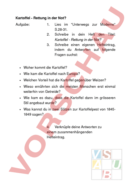Kartoffel Rettung in der Not? Aufgabe: 1. 2. 3. Lies im Unterwegs zur Moderne S.2831. Schreibe in dein Heft den Titel: Kartoffel Rettung in der Not? Schreibe einen eigenen Hefteintrag, indem du Antworten auf folgende Fragen suchst: • Woher kommt die Kartoffel? • Wie kam die Kartoffel nach Europa? • Welchen Vorteil hat die Kartoffel gegenüber Weizen? • Wieso ernährten sich die meisten Menschen erst einmal weiterhin von Getreide? • Wie kam es dazu, dass die Kartoffel dann im grösseren Stil angebaut wurde? • Was kannst du in zwei Sätzen zur Kartoffelpest von 1845 1849 sagen? 4. Verknüpfe deine Antworten zu einem zusammenhängenden Hefteintrag.