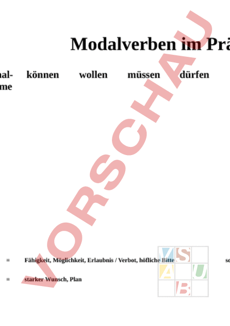 Modalverben im Präsens PersonalPronome können wollen müssen können (nicht Fähigkeit, Möglichkeit, Erlaubnis Verbot, höfliche Bitte wollen starker Wunsch, Plan dürfen sollen sollen möchten mögen Rat, Aufforderung, Pflicht, Plan so stark wie müssen) müssen Aufforderung, Pflicht, Notwendigkeit, Regel, Gesetz möchten Wunsch, Plan, Bitte dürfen Erlaubnis Verbot, höfliche Frage mögen Gefallen Missfallen (gern haben)