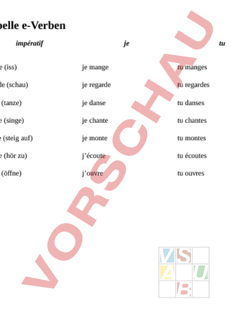 Tabelle e-Verben impératif je tu il/elle mange (iss) je mange tu manges il/elle mange regarde (schau) je regarde tu regardes il/elle regarde danse (tanze) je danse tu danses il/elle danse chante (singe) je chante tu chantes il/elle chante monte (steig auf) je monte tu montes il/elle monte écoute (hör zu) jécoute tu écoutes il/elle écoute ouvre (öffne) jouvre tu ouvres il/elle ouvre impératif je tu il/elle Tabelle s-Verben impératif je tu il/elle sors (geh hinaus) je sors tu sors il/elle sort bois (trink) je bois tu bois il/elle boit cours (renne) je cours tu cours il/elle court prends (nimm) je prends tu prends il/elle prend finis (beende) je finis tu finis il/elle finit écris (schreibe) jécris tu écris il/elle écrit apprends (lerne) japprends tu apprends il/elle apprend impératif je tu il/elle