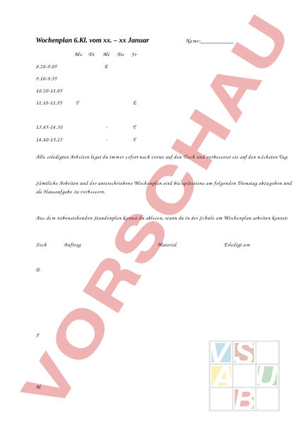 Wochenplan 6.Kl. vom xx. – xx Januar Mo 8.209.05 Di Mi Do Name: Fr 9.109.55 10.2011.05 11.1011.55 13.4514.30 14.4015.25 Alle erledigten Arbeiten legst du im er sofort nach vorne auf den Tisch und verbesserst sie auf den ächsten Tag. Sä mtliche Arbeiten und der unterschriebene Wochenplan sind bis spätestens am folgenden Dienstag abzugeben und als Hausaufgabe zu verbessern. Aus de nebenstehenden Stundenplan kannst du ablesen, wann du in der chule am Wochenplan arbeiten kannst: Fach Auftrag Material Erledigt am MU Diverses Von deinen Eltern eingesehen: