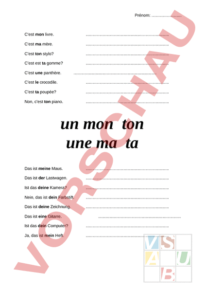 Arbeitsblatt: un mon ton, une ma ta