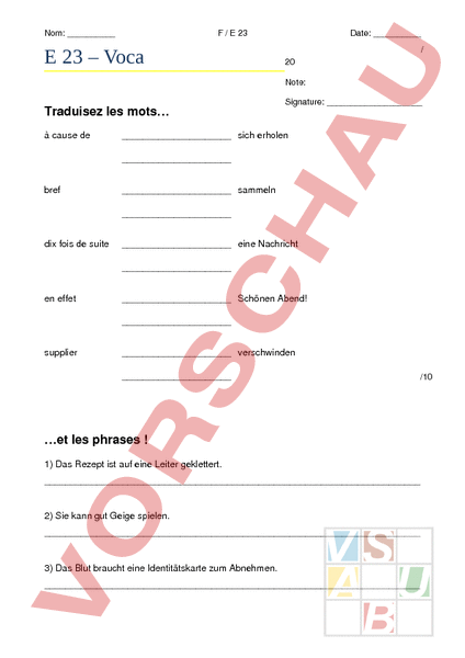 Nom: / 23 23 – Voca Date: 20 Note: Traduisez les mots à cause de Signature: sich erholen bref sammeln dix fois de suite eine Nachricht en effet Schönen Abend! supplier verschwinden et les phrases 1) Das Rezept ist auf eine Leiter geklettert. 2) Sie kann gut Geige spielen. 3) Das Blut braucht eine Identitätskarte zum Abnehmen. /10 Nom: / 23 Date: 4) Wir haben ein Periskop gebastelt. 5) Sie erkennen die Stimme von Leduc. /10