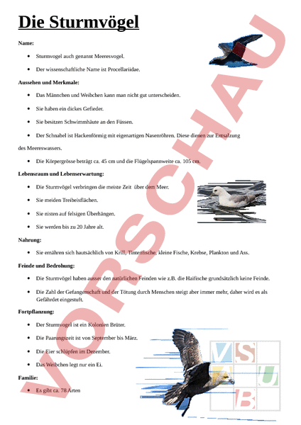 Die Sturmvögel Name: • Sturmvogel auch genannt Meeresvogel. • Der wissenschaftliche Name ist Procellariidae. Aussehen und Merkmale: • Das Männchen und Weibchen kann man nicht gut unterscheiden. • Sie haben ein dickes Gefieder. • Sie besitzen Schwimmhäute an den Füssen. • Der Schnabel ist Hackenförmig mit eigenartigen Nasenröhren. Diese dienen zur Entsalzung des Meereswassers. • Die Körpergrösse beträgt ca. 45 cm und die Flügelspannweite ca. 105 cm. Lebensraum und Lebenserwartung: • Die Sturmvögel verbringen die meiste Zeit über dem Meer. • Sie meiden Treibeisflächen. • Sie nisten auf felsigen Überhängen. • Sie werden bis zu 20 Jahre alt. Nahrung: • Sie ernähren sich hautsächlich von Krill, Tintenfische, kleine Fische, Krebse, Plankton und Ass. Feinde und Bedrohung: • Die Sturmvögel haben ausser den natürlichen Feinden wie z.B. die Haifische grundsätzlich keine Feinde. • Die Zahl der Gefangenschaft und der Tötung durch Menschen steigt aber immer mehr, daher wird es als Gefährdet eingestuft. Fortpflanzung: • Der Sturmvogel ist ein Kolonien Brüter. • Die Paarungszeit ist von September bis März. • Die Eier schlüpfen im Dezember. • Das Weibchen legt nur ein Ei. Familie: • Es gibt ca. 78 Arten • Unterstamm: Wirbeltiere • Klasse: Vögel • Ordnung: Röhrennasen • Familie: Sturmvögel Andere Arten: • Möwensturmvogel, Riesensturmvogel, Silbersturmvogel, Eissturmvogel, Kapsturmvogel, Schneesturmvogel, Blausturmvogel, Belchersturmvogel. Ivana, Michèle, Sina, Davide