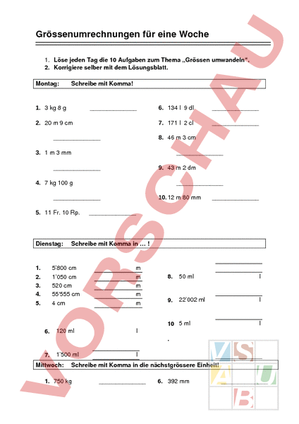 Mit diesen Arbeitsblättern können die Kinder jeden Tag zehn Aufgaben zum Thema Grössenumrechnungen lösen. Verschiedene Einheiten sind gemischt und das Level ist eher hoch.