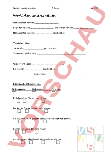 Wortarten unterscheiden 3.Klasse DK 12‘12 Wortarten unterscheiden Namenwörter heissen Begleiter heissen und stehen vor den Namenwörter werden geschrieben. Tunwörter heissen. Sie werden geschrieben. Tunwörter beschreiben, . Wiewörter heissen Sie werden geschrieben. beschreiben,. Fülle in die Kästchen ein: Adjektiv Nomen Verb Es fallen dicke Flocken vom Himmel. Die Kinder freuen sich auf den Schnee. Sie wollen mit dem grossen Schlitten den Berg hinab fahren. Schnell laufen sie den Berg hinauf. Als es langsam Abend wird, müssen sie nach Hause.