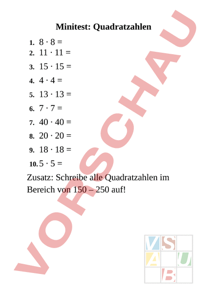 Arbeitsblatt: Minitest Quadratzahlen