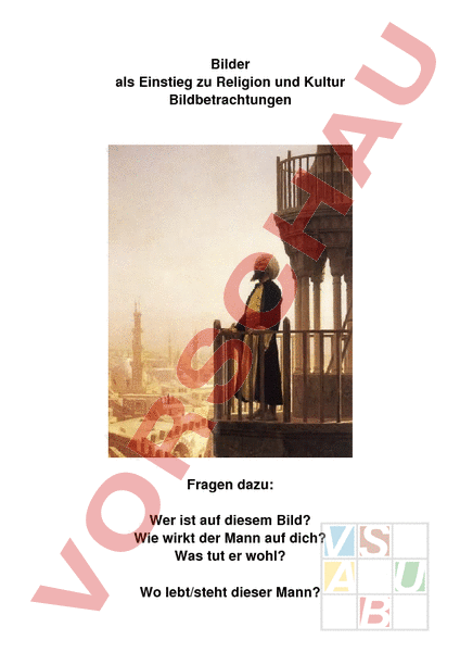Bilder als Einstieg zu Religion und Kultur Bildbetrachtungen Fragen dazu: Wer ist auf diesem Bild? Wie wirkt der Mann auf dich? Was tut er wohl? Wo lebt/steht dieser Mann? Warum ist er an diesem Ort Welche Sinne sind angesprochen? Was sieht der Mann? Was hört er? Was fühlt er? Vergleiche diese Gebäude: Was ist gleich, verschieden? Wie wirken die Bilder auf dich? Wofür sind diese Häuser gebaut worden? Woher kommen die Menschen, welche diese Gebäude aufsuchen? Kennst du ähnliche Versammlungsorte? Wofür versammeln sich Menschen? Glocken Wie viele Menschen sind hier versammelt? Was für Berufe üben diese wohl aus? Woher kommen sie? Wohin schauen sie? Warum hat es so viele Blumen im Bild? Ist ein Fest angesagt? Was für ein Fest könnte es dann sein? Welche Feste kennst du? Schreibe deine Gedanken auf.