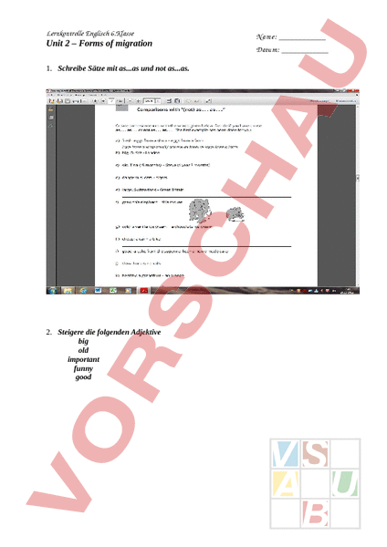 Lernkontrolle Englisch 6.Klasse Unit 2 – Forms of migration 1. Schreibe Sätze mit as.as und not as.as. 2. Steigere die folgenden Adjektive big old important funny good Name: Datum: 3. Übersetze die Wörter in der verlangten Sprache Grösse, Umfang, Format Meer amazing Schmetterling Knäuel Schnur metre reach Sich die Zähne putzen Sein Bestes tun/geben take long Prüfung Zeit verbringen Aufwachsen, heranwachsen tie stay awake Sich kümmern um, sorgen für 4. Setze have to/has to oder do/does in die Sätze ein. a) call my friend. b) Miranda take bath because she is wet. c) he have to clean the dishes d) We help our mother in the kitchen. e) you have an animal at home f) My dad Punkte: wear tie because he works in bank. /23 Note: Eltern: