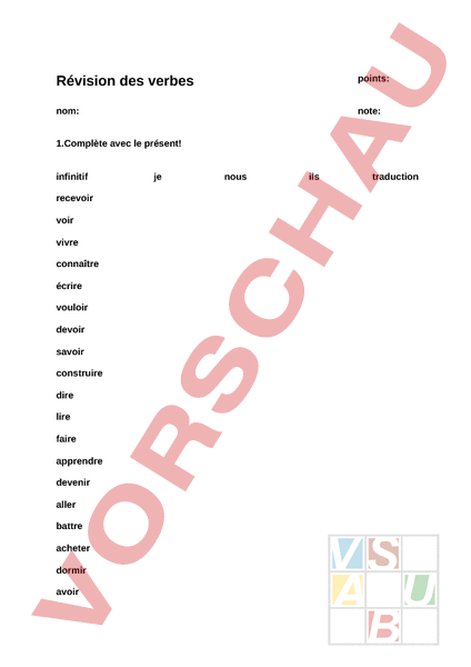 Révision des verbes points: nom: note: 1.Complète avec le présent! infinitif recevoir voir vivre connaître écrire vouloir devoir savoir construire dire lire faire apprendre devenir aller battre acheter dormir avoir je nous ils traduction placer ouvrir vendre jeter envoyer être 2. Mettez à limparfait et au passé composé! revenir elle imparfait passé composé croire vous traduire je descendre ils manger nous promettre tu sortir elles offrir il comprendre je recevoir tu décrire il se lever elles commencer il devoir ils vivre nous BONNE HANCE!