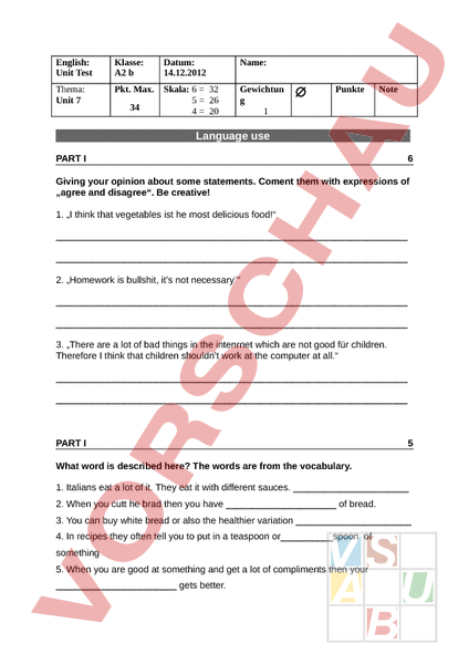 English: Unit Test Klasse: A2 Datum: 14.12.2012 Name: Thema: Unit 7 Pkt. Max. Skala: 6 32 5 26 4 20 Gewichtun 1 34 Punkte Note Language use PART 6 Giving your opinion about some statements. Coment them with expressions of „agree and disagree. Be creative! 1. „I think that vegetables ist he most delicious food! 2. „Homework is bullshit, its not necessary 3. „There are lot of bad things in the intenrnet which are not good für children. Therefore think that children shouldnt work at the computer at all. PART 5 What word is described here? The words are from the vocabulary. 1. Italians eat lot of it. They eat it with different sauces. 2. When you cutt he brad then you have of bread. 3. You can buy white bread or also the healthier variation 4. In recipes they often tell you to put in teaspoon orspoon of something 5. When you are good at something and get lot of compliments then your gets better. Grammar PART 13 Put into the gaps one of the follwoing words. some/any something/anything someone/anyone (or -body) somewhere/anywhere 1. He lives in the USA. 2. Did see what has happened? 3. There is fruit on the table. 4. Did you talk to 5. There isnt at school today. Its Sunday. 6. Would you like to eat? 7. Id like to go in the South of Europe next holiday. 8. Have you ever met very famous? 9. Does know who John Meier is? 10. There are people outside the house; can hear them. 11. What are you doing at the Weekend? Im not going 12. Its really dark, cant see 13. She said but couldnt hear it. 14. wasnt happy with the situation but didnt say 15. Listen! What? cant hear 16. never get form birthday. 17. Im so thirsty! need to drink! 18. Is there ice cream left? 19. There is milk in the fridge. 20. Theres hardly to eat in the fridge. Only things to drink. 21. We have money left. 22. You are so quite. Is there you want to tell me? 23. Where are the keys? They must be in the kitchen! 24. Its ringing. Can you open the door, please? There is 25. Id like to live in twon without cars. 26. Why didnt you buy to drink? PART 10 Fill in one of the following expressions. (how) much (how)many (a)few (a) little 1. How times told you that?! 2. There isnt bread left. 3. The party was so cool. We had fun. 4. Do you have hobbies? 5. There are people at the beach today. 6. students go to our school? 7. There is only cheese in the fridge. 8. ate too sweet things today! ate so biskuits. Now there are only 9. On Saturday morning theres only traffic. 10. have only money left. 11. money do you have in your wallet? 12. Only students at our school play tennis. 13. She had only to say. 14. saw him, only minutes ago. 15. Its smelling bad in the room! need fresh air! 16. Before decide, need time to think about it. 17. Would you like to have some tea? Yes,, please. 18. Everybody needs luck.