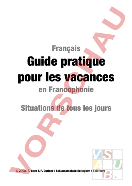 Français Guide pratique pour les vacances en Francophonie Situations de tous les jours 2008. R. Born F. Gurtner Sekundarschule Kollegium Solothurn FG Guide pratique pour les vacances Dans la rue Pardon monsieur madame Bonjour monsieur madame Pour aller à la/ à l/ au/ aux. Bonjour, je cherche Pouvez-vous mindiquer où se trouve Je ne sais pas. à Je ne suis pas dici. à OU Bien sûr. Vous avez une carte de la ville On est ici et (léglise) est là (à X) Oui. OU Non. Alors, vous prenez la première à gauche, passez devant le théâtre, tournez à droite, continuez sur 200 mètres et vous ne pourrez pas la manquer (à X) Merci. Oui, cest le bus numéro 17. Larrêt sappelle « Notre Dame » (à X) On peut aller en bus Oui, mais il a un changement à « Stand » (à X) Et en métro Vous marchez 100 mètres puis vous tournez à droite et vous tombez dessus. Et où se trouve la station de métro X Au revoir. Merci beaucoup Au revoir. -1- FG Guide pratique pour les vacances Au café au restaurant Bonjour monsieur madame Bonjour monsieur madame Que désirez-vous Quest-ce que vous voulez Je vais prendre à OU Vous avez une carte Bien sûr, je vous en amène une. Merci bien. Voilà la carte. Merci. Vous avez fait votre choix Vous avez choisi Oui, je vais prendre Un coca. Le menu. Du poisson. Une pizza jambon. Autre chose Et comme boisson Et à manger Je vais prendre à OU Cest tout merci Merci Voilà votre commande Merci Bien sûr Voilà laddition. Et voilà francs en retour Merci. Bonne journée soirée. Au revoir. à Je peux avoir laddition, sil vous plaît Je peux payer Voilà francs Euro. Voilà ma carte de crédit. Merci. Pareillement. Au revoir. -2- FG Guide pratique pour les vacances lhôtel Bonsoir monsieur madame Bonsoir monsieur madame Bien sûr Cest la chambre 26. Voici la clé. à Jai réservé une chambre au nom de OU Vous avez une chambre pour personne(s) Vous reste-t-il une chambre pour personne(s) Pour combien de nuits Très bien. Nous avons une chambre, la 26. Pouvez-vous remplir cette fiche. nuit(s). Oui, bien sûr. à OU Désolé mais cest possible pour nuit(s) seulement. Dommage. à OU Ca ne fait rien, on la prend quand même déjà pour nuits. Très bien. Alors cest la chambre 26. Pouvez-vous remplir cette fiche Oui, bien sûr. à Alors ça fera francs Euro. Voilà francs Euro. Le (petit-) déjeuner est-il compris Oui, cest de 7h à 10h. OU Non, il faut payer un supplément de 20.- par personne. Merci Bonne nuit Cest trop cher, ça ne mintéresse pas. OU Daccord, je viendrai nous viendrons (petit-) déjeuner chaque matin. Merci. Merci Bonne nuit -3- FG Guide pratique pour les vacances Au magasin (de vêtements) Bonjour monsieur madame Bonjour monsieur madame Je peux vous aider Puis-je vous aider Vous cherchez quelque chose à Non, je regarde (simplement), merci. OU Oui, je cherche Oui, jaimerais Cest par là . Quelle est votre taille (habits) Quelle est votre pointure (chaussures) / / / XL 36 44 Essayez peut-être ceci Non, ça ne me plaît pas. à OU Oui. Alors Cest parfait. à OU Cest trop grand petit à OU Ca ne me plaît pas, pouvez-vous men montrer un autre à Y Et ceci Vous voulez lessayer Cest beaucoup mieux W Cest tout Autre chose Et avec ça Jaimerais je cherche encore OU Cest tout merci Vous payez à la caisse monsieur madame. Daccord. Merci. Ca fait francs Euro. Ca coûte francs Euro. francs Euro, sil vous plaît. Les voilà. Voilà francs Euro. Et voilà francs en retour Merci. Bonne journée soirée. Au revoir. à X Merci. Pareillement. Au revoir. -4- FG Guide pratique pour les vacances Au marché à lépicerie Bonjour monsieur madame Bonjour monsieur madame A qui le tour Cest à qui Cest à moi Cest mon tour Que désirez-vous Quest-ce que vous voulez Combien coûte (le melon) francs Euro. Alors Jaimerais (des pommes). Je voudrais Il me faudrait Donnez-moi Combien Un kilo. Trois. Un sac. Un litre. Cest tout Autre chose Et avec ça Jaimerais encore OU Cest tout merci Ca fait combien Combien ça coûte Ca fait francs Euro. Ca coûte francs Euro. francs Euro, sil vous plaît. Les voilà. Voilà francs Euro. Et voilà francs en retour Merci. Bonne journée soirée. Au revoir. à X Merci. Pareillement. Au revoir. -5- FG Guide pratique pour les vacances Vocabulaire supplémentaire -6- FG