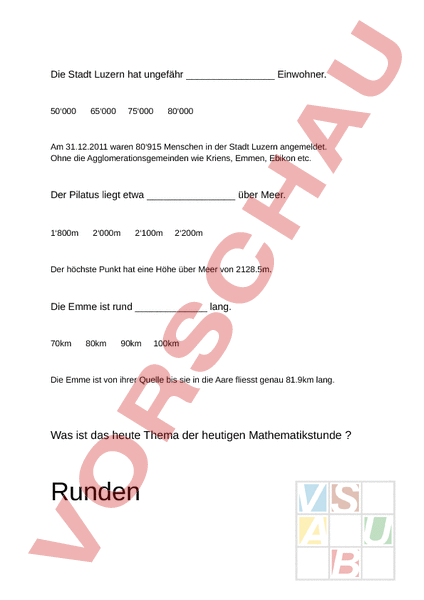 Die Stadt Luzern hat ungefähr Einwohner. 50‘000 65‘000 75‘000 80‘000 Am 31.12.2011 waren 80‘915 Menschen in der Stadt Luzern angemeldet. Ohne die Agglomerationsgemeinden wie Kriens, Emmen, Ebikon etc. Der Pilatus liegt etwa über Meer. 1‘800m 2‘000m 2‘100m 2‘200m Der höchste Punkt hat eine Höhe über Meer von 2128.5m. Die Emme ist rund lang. 70km 80km 90km 100km Die Emme ist von ihrer Quelle bis sie in die Aare fliesst genau 81.9km lang. Was ist das heute Thema der heutigen Mathematikstunde Runden