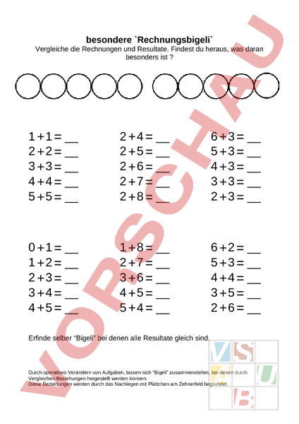 besondere Rechnungsbigeli Vergleiche die Rechnungen und Resultate. Findest du heraus, was daran besonders ist 1 1 2 2 3 3 4 4 5 5 2 4 2 5 2 6 2 7 2 8 6 3 5 3 4 3 3 3 2 3 0 1 1 2 2 3 3 4 4 5 1 8 2 7 3 6 4 5 5 4 6 2 5 3 4 4 3 5 2 6 Erfinde selber Bigeli bei denen alle Resultate gleich sind. Durch operatives Verändern von Aufgaben, lassen sich Bigeli zusammenstellen, bei denen durch Vergleichen Beziehungen hergestellt werden können. Diese Beziehungen werden durch das Nachlegen mit Plättchen am Zehnerfeld begründet. besondere Rechnungsbigeli Aber Achtung lege die Rechnungen und schreibe nicht einfach ein Resultat hinein. 0 2 1 3 2 4 3 5 4 5 2 8 3 7 4 6 5 5 4 4 5 1 6 2 4 3 3 4 2 5 6 2 5 2 4 2 3 2 1 2 3 1 3 2 3 4 3 5 3 6 98765- 1 2 3 4 5 6 5 4 3 2 10 1 2 3 4 2