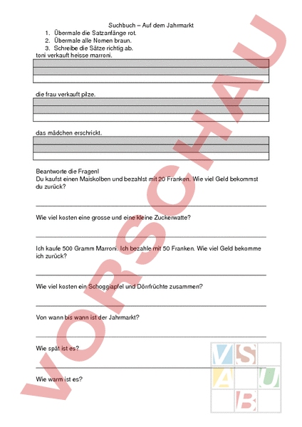 Suchbuch – Auf dem Jahrmarkt 1. Übermale die Satzanfänge rot. 2. Übermale alle Nomen braun. 3. Schreibe die Sätze richtig ab. toni verkauft heisse marroni. die frau verkauft pilze. das mädchen erschrickt. Beantworte die Fragenl Du kaufst einen Maiskolben und bezahlst mit 20 Franken. Wie viel Geld bekommst du zurück? Wie viel kosten eine grosse und eine kleine Zuckerwatte? Ich kaufe 500 Gramm Marroni. Ich bezahle mit 50 Franken. Wie viel Geld bekomme ich zurück? Wie viel kosten ein Schoggiapfel und Dörrfrüchte zusammen? Von wann bis wann ist der Jahrmarkt? Wie spät ist es? Wie warm ist es? Schau dir das Bild genau an. Schreibe eine Geschichte zu einer Person auf dem Jahrmarkt. Denk an die Fragen: Wer, wo, was.
