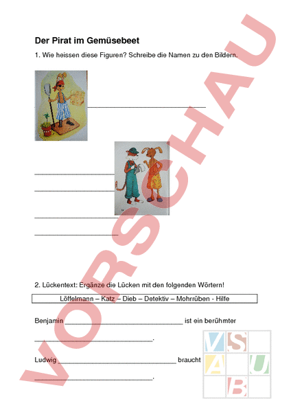 Der Pirat im Gemüsebeet 1. Wie heissen diese Figuren? Schreibe die Namen zu den Bildern. 2. Lückentext: Ergänze die Lücken mit den folgenden Wörtern! Löffelmann – Katz – Dieb – Detektiv – Mohrrüben Hilfe Benjamin ist ein berühmter. Ludwig braucht. Ihm wurden seine gestohlen. Wer war der? 3. Lückentext: Mohrrüben – nichts – Schurke – Schatz – Pirat Der hat geklingelt. Er will ausgraben. Vielleicht ist ein versteckt. Aber sie haben gefunden. Na so ein 4. Zeichnet eine Schulzimmerschatzkarte.
