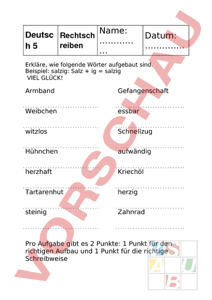 Name: Deutsc Rechtsch reiben h5 Datum: Erkläre, wie folgende Wörter aufgebaut sind. Beispiel: salzig: Salz ig salzig VIEL GLÜCK! Armband Gefangenschaft Weibchen essbar witzlos Schnellzug Hühnchen aufwändig herzhaft Kriechöl Tartarenhut herzig steinig Zahnrad Pro Aufgabe gibt es 2 Punkte: 1 Punkt für den richtigen Aufbau und 1 Punkt für die richtige Schreibweise Punkte: /28 Note: Unterschrift: .