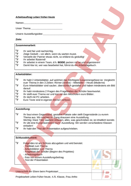 Arbeitsauftrag Leben früher-heute Namen: Unser Thema: Unsere Ausstellungsidee: Ziele: Zusammenarbeit: Ihr seid fair und nachsichtig. Zeige Geduld – vor allem, wenn du warten musst. Versteht der Partner etwas nicht, so erklärst du geduldig! Ihr arbeitet flüsternd! Ihr arbeitet in einem Team, d.h. BEIDE packen mit an und organisieren! Damit klar ist, wer was bearbeitet hat, führst du ein Arbeitstagebuch. Arbeitsblätter: Ihr habt 2 Arbeitsblätter, auf welchen das Wichtigste zusammengefasst ist. Vergleicht euer Thema in den 3 Zeiten: Römer (Antike) – Mittelalter – Heute (Moderne) Eure Arbeitsblätter sind sauber, übersichtlich gestaltet und haben mindestens ein Bild darauf. Ihr habt mindestens 2 Fragen des Frageblattes der Schüler beantwortet. Ihr stellt euer Thema vor und lest mit den Mitschülern eure Blätter. Ihr dürft mit PC arbeiten. Eure Texte sind in eigenen Worten verfasst. Ausstellung: Ihr baut einen Gegenstand, gestaltet Plakate oder stellt Gegenstände zu eurem Thema aus. Wir machen im Gang draussen eine Ausstellung. Wichtig: Klare Titel, saubere Arbeiten, alles, was geschrieben ist, ist inhaltlich korrekt. Ihr übt eine Kurzpräsentation eurer Ausstellung: Wir werden verschiedene Klassen einladen! Ihr habt den Text der Präsentation aufgeschrieben. Schlussdokument: Folgendes ist am Schluss abzugeben und wird benotet: Titelblatt zum Thema Arbeitsblätter zum Thema Frageblatt der Schüler (Beginn des Projektes) Arbeitstagebuch Foto von eurem Ausstellungsbeitrag Text der Präsentation Unterschrift der Eltern beim Projektstart: Projektarbeit Leben früher-heute, 4./5. Klasse, Frau Artho Benotung Schlussdokument „Leben früher – heute Name: Unser Thema 6 5 6 3 2 1 Schlussdokument: Es sind alle Teile vorhanden. Schlussdokument: Folgende Teile fehlen Titelblatt zum Thema Arbeitsblätter zum Thema Frageblatt der Schüler Arbeitstagebuch Foto von eurem Ausstellungsbeitrag Text der Präsentation Titelblatt zum Thema Arbeitsblätter zum Thema Frageblatt der Schüler Arbeitstagebuch Foto von eurem Ausstellungsbeitrag Text der Präsentation Arbeitsblätter: Es ist alles vorhanden. Arbeitsblätter: Folgendes fehlt Ihr habt 2 Arbeitsblätter gestaltet. Es hat mind. ein Bild drauf. Sie sind sauber und übersichtlich gestaltet. Ihr habt mind. 2 Fragen vom Frageblatt beantwortet. Ihr vergleicht das Thema in den 3 Zeiten Römer Mittelalter Heute. Eure Texte sind in eigenen Worten verfasst. Ihr habt 2 Arbeitsblätter gestaltet. Es hat mind. ein Bild drauf. Sie sind sauber und übersichtlich gestaltet. Ihr habt mind. 2 Fragen vom Frageblatt beantwortet. Ihr vergleicht das Thema in den 3 Zeiten Römer Mittelalter Heute. Eure Texte sind in eigenen Worten verfasst. Ausstellung: Es ist alles vorhanden. Ausstellung: Folgendes fehlt Ihr habt einen Beitrag zur Ausstellung geleistet. Der Beitrag hat einen klaren Titel. Alles ist sauber gearbeitet. Inhaltlich ist alles korrekt. Der Text der Präsentation wurde aufgeschrieben. Ihr präsentiert euern Beitrag. Ihr habt einen Beitrag zur Ausstellung geleistet. Der Beitrag hat einen klaren Titel. Alles ist sauber gearbeitet. Inhaltlich ist alles korrekt. Der Text der Präsentation wurde aufgeschrieben. Ihr präsentiert euern Beitrag. Zusammenarbeit: Es ist alles vorhanden. Zusammenarbeit: Folgendes fehlt. Du arbeitetest fair und rücksichtsvoll. Du sprachst flüsternd. Du hast die Arbeit mit dem Partner geteilt. Das Arbeitstagebuch wurde jeden Tag geführt. Du hast deinem Partner geholfen, falls Hilfe nötig war. Du hast Geduld gezeigt. Du arbeitetest fair und rücksichtsvoll. Du sprachst flüsternd. Du hast die Arbeit mit dem Partner geteilt. Das Arbeitstagebuch wurde jeden Tag geführt. Du hast deinem Partner geholfen, falls Hilfe nötig war. Du hast Geduld gezeigt. Punkte total: 24 Punkte erreicht: Unterschrift: Note: Projektarbeit Leben früher-heute, 4./5. Klasse, Frau Artho Ablauf Leben früher-heute: 1. Themen auf Blätter schreiben, noch nicht vergeben! 2. Jedes Kind schreibt während 10 min zu den Themen Fragen auf, welche es interessieren würde. Es muss nicht jedes Kind zu jedem Thema Fragen stellen. 3. Themen werden verteilt. 4. Material wird gesichtet, gelesen und gelöst. 5. Was ist wichtig? Welche Fragen können wir beantworten? 6. Arbeitsblatt 7. Ausstellung 8. Schlussdokument Projektarbeit Leben früher-heute, 4./5. Klasse, Frau Artho Projektarbeit Leben früher-heute, 4./5. Klasse, Frau Artho Arbeitstagebuch „Leben früher-heute Name: Thema: Wochentag Datum Zeitaufwand Schule Zu Hause Arbeit Achtung klein schreiben! Start nächstes Mal Bemerkungen Sch/L z.B. Mi 15.6.11 z.B. 70min z.B. Schule z.B. 1. Blatt Sklavenarbeit lesen 2. Auftrag dazu lösen 3. mit Hansli besprochen, was als Nächstes kommt 4. Bild gezeichnet z.B. Bild weiter zeichnen und ausmalen z.B. Der Auftrag war sehr schwer. Projektarbeit Leben früher-heute, 4./5. Klasse, Frau Artho Deine Zeichnung ist toll! Arbeitstagebuch „Leben früher-heute Name: Wochentag Datum Thema: Zeitaufwand Schule Zu Hause Arbeit Achtung klein schreiben! Projektarbeit Leben früher-heute, 4./5. Klasse, Frau Artho Start nächstes Mal Bemerkungen Sch/L Projektarbeit Leben früher-heute, 4./5. Klasse, Frau Artho
